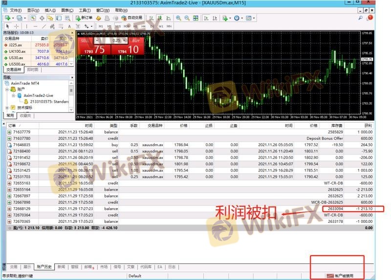 客户 交易账户 2133103575 11月23号在aximtrade 平台, 网址https://www.aximtrade.com/?language=zh 入金1000美金 ,全程手动下单交易,账户盈利1213美金,于11.月29号申请出金盈利,被平台告知违规交易,2个ip登入,盈利强制扣除,账户禁止交易,后台删除。随便找个理由就把交易者的利润给扣除这个无耻的做法,我将实名举报 aximtrade 是个超级黑平台,打着赠金幌子欺诈客户入金交易,希望广大汇友远离这个平台,积极帮忙转载,避免更多汇友深受其害,本人也将实在媒体,推特 脸书,媒体曝光,及在国家反诈骗中心实名举报该平台入金通道涉嫌诈骗,洗钱,非法经营 。aximtrade 平台 黑平台!!!!!!!!!!!!
